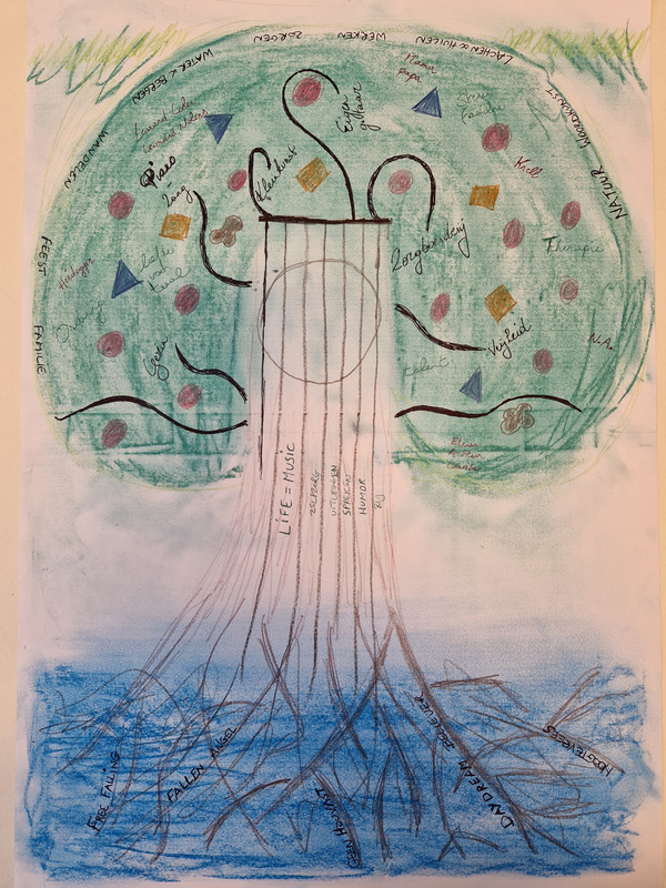 Elk onderdeel staat symbool voor een ander aspect van hun leven. Allemaal bedoeld om meer dan enkel het vaak diep ingesleten probleemverhaal te verbreden: je jeugd was méér dan enkel het verwaarlozende gezin van herkomst, en je heden is méér dan problemen op school. Vele personen, vele contexten, krachten en interesses worden neergeschreven op de tekening. Ik geef speciaal aandacht aan de takken: waar wil je graag nog naartoe groeien? Wat zijn je hoop, dromen en wensen voor de toekomst?