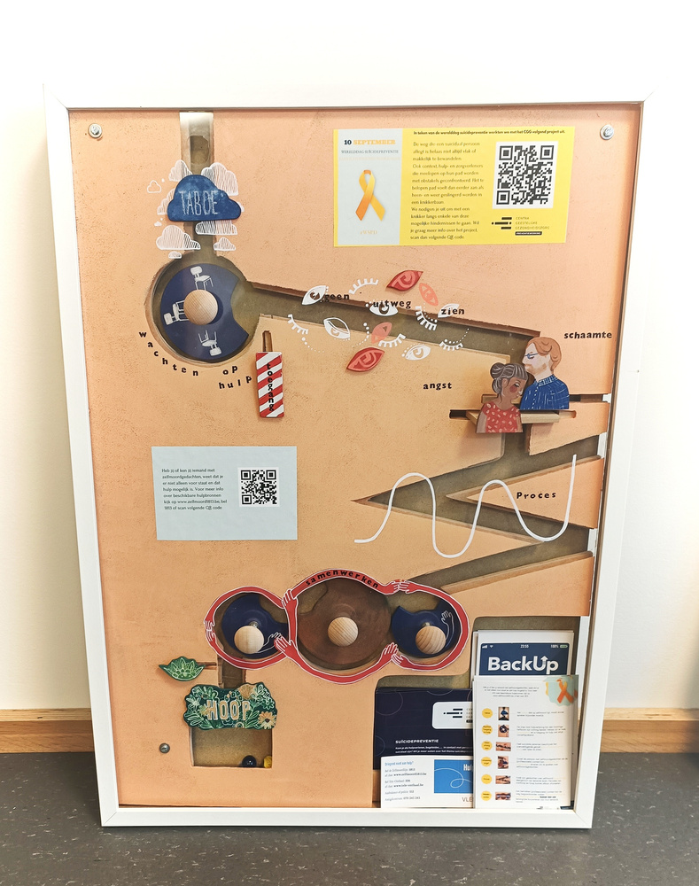Creatieve duizendpoot Laura maakt voor de werelddag suïcidepreventie zelf een knikkerbaan. Je werd als toeschouwer uitgenodigd om met een knikker langs de verschillende hindernissen te gaan die een suïcidaal persoon mogelijks ook kan tegenkomen op zijn of haar pad. Op en naast de knikkerbaan vind je info naar beschikbare hulpbronnen.